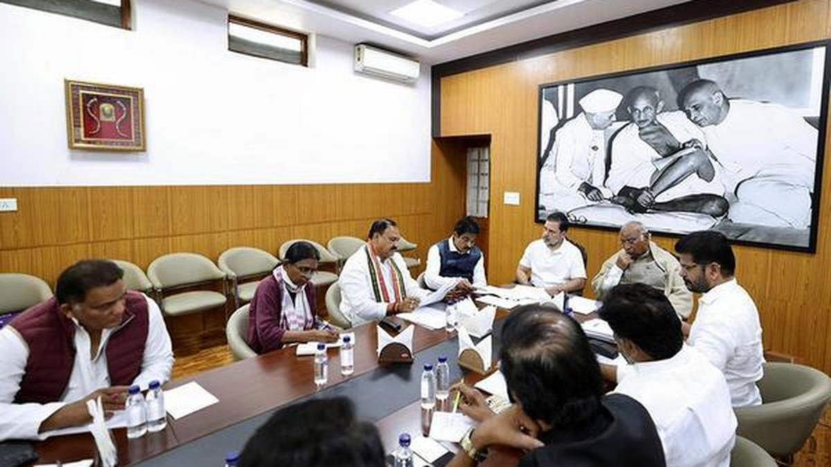 న్యూఢిల్లీలో జరిగిన పార్టీ సమావేశానికి అధ్యక్షత వహించిన కాంగ్రెస్ అధ్యక్షుడు మల్లికార్జున్ ఖర్గే యొక్క ప్రాతినిధ్య చిత్రం | ఫోటో క్రెడిట్: PTI