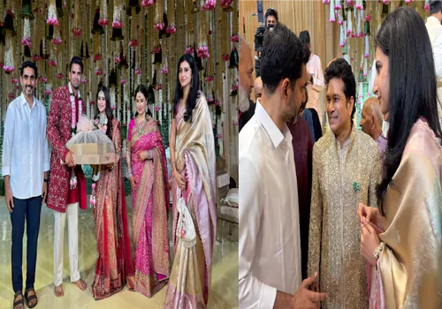 క్రికెట్ దిగ్గజం సచిన్ టెండూల్కర్ ఇంట పెళ్లి సందడి. ఆయన కుమారుడు వివాహం ఈరోజు ముంబైలో ఘనంగా జరిగింది. ఈ వేడుకకు ఏపీ ఐటీ, విద్యాశాఖ మంత్రి నారా లోకేశ్ తన సతీమణి బ్రాహ్మణితో కలిసి నటించారు. లోకేశ్ దంపతులకు సచిన్ టెండూల్కర్ కుటుంబం సాదరంగా స్వాగతం పలికింది. ఈ సందర్భంగా నూతన వధూవరులను లోకేశ్ దంపతులు మనస్ఫూర్తిగా ఆశీర్వదించారు. వారికి పుష్పగుచ్ఛం అందించి శుభాకాంక్షలు తెలియజేశారు. ఈ పెళ్లి మహోత్సవానికి ఐసీసీ చైర్మన్ జైషా, టీమ్ ఇండియా మాజీ కెప్టెన్ ధోనీ, క్రీడా, రాజకీయ, వ్యాపార రంగాలకు చెందిన ప్రముఖులు హాజరైన జంటకు శుభాకాంక్షలు తెలిపారు.