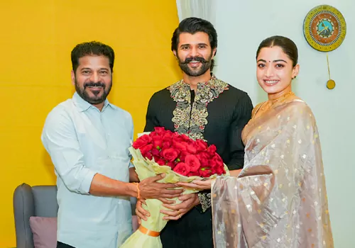 ఇటీవల వివాహ బంధంతో ఒక్కటైన టాలీవుడ్ హీరో విజయ్ దేవరకొండ-రష్మిక దంపతులను తెలంగాణ ముఖ్యమంత్రి రేవంత్రెడ్డి ఆశీర్వదించారు. రిసెప్షన్ కార్యక్రమం సమయంలో ఢిల్లీలో ఉన్న ముఖ్యమంత్రి తిరిగి హైదరాబాద్ చేరుకున్న తర్వాత ప్రత్యేకంగా విజయ్ దేవరకొండ నివాసానికి వెళ్లి కొత్త జంటను కలిశారు. ఈ సందర్భంగా దంపతులకు శుభాకాంక్షలు తెలుపుతూ వారి దాంపత్య జీవితం ఆనందంగా సాగాలని ఆశీర్వదించారు. సీఎం రేవంత్ రెడ్డి వచ్చిన సందర్భంగా కుటుంబ సభ్యులు, సన్నిహితులు ఆయనకు ఆతిథ్యం ఇచ్చారు. కొత్త జీవితాన్ని ప్రారంభించిన విజయ్ దేవరకొండ–రష్మిక దంపతులకు సినీ, రాజకీయ ప్రముఖుల నుంచి శుభాకాంక్షలు వెల్లువెత్తుతున్నాయి.
