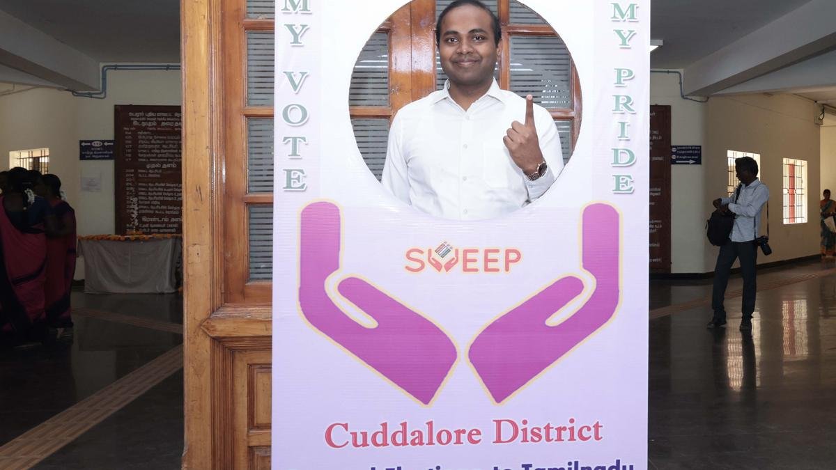 బుధవారం కడలూరు కలెక్టరేట్లో ప్రారంభించిన సెల్ఫీ పాయింట్లో జిల్లా ఎన్నికల అధికారి, కలెక్టర్ సీబీ ఆదిత్య సెంథిల్ కుమార్. | ఫోటో క్రెడిట్: SPECIAL ARRANGEMENT