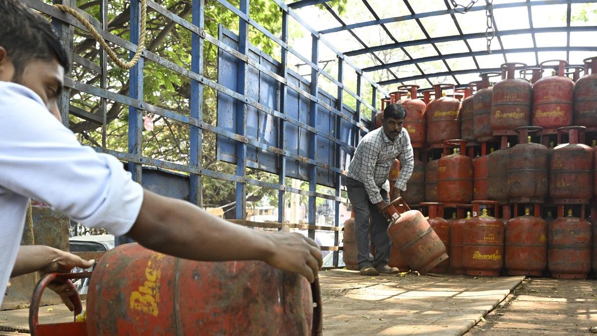 గురువారం (మార్చి 12, 2026) హైదరాబాద్‌లోని కవాడిగూడ వద్ద కార్మికులు ట్రక్కు నుండి లిక్విఫైడ్ పెట్రోలియం గ్యాస్ (LPG) సిలిండర్‌లను అన్‌లోడ్ చేస్తున్నారు | ఫోటో క్రెడిట్: RAMAKRISHNA G