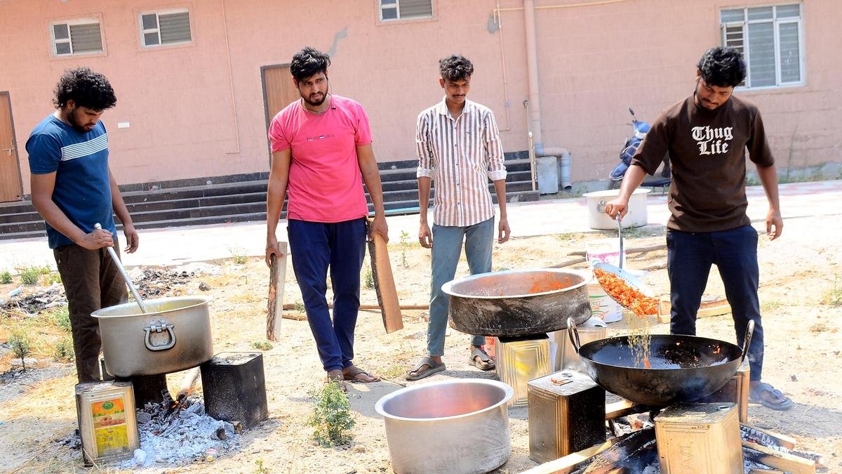 పశ్చిమాసియాలో సంక్షోభం కారణంగా ఎల్పిజి గ్యాస్ సిలిండర్ల కొరత ఏర్పడటంతో సంగారెడ్డి మెడికల్ కళాశాల సిబ్బంది శనివారం సంగారెడ్డిలో వంటచెరకులతో వంటలు చేస్తున్నారు. | ఫోటో క్రెడిట్: MOHD ARIF