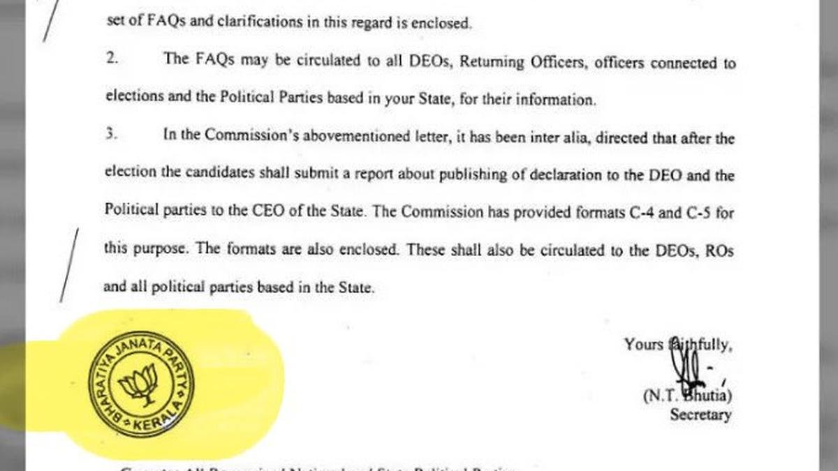 ఇటీవల రాజకీయ పార్టీలకు పంపిణీ చేసిన ఎన్నికలకు సంబంధించిన మార్గదర్శకాలపై 2019 ఎన్నికల కమిషన్ ఆఫ్ ఇండియా (EC) లేఖపై భారతీయ జనతా పార్టీ (బిజెపి) కేరళ యూనిట్ ముద్ర ఉండటం రాష్ట్రంలో ఏప్రిల్ 9 అసెంబ్లీ ఎన్నికలకు నామినేషన్ల సమర్పణకు చివరి రోజైన సోమవారం రాష్ట్రంలో దుమారం రేపింది.