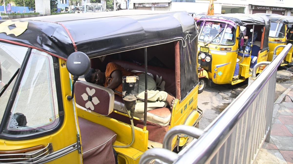 మంగళవారం హైదరాబాద్లో ఎల్పిజి రీఫిల్ కోసం క్యూలో నిరీక్షిస్తున్న ఆటో డ్రైవర్ తన వాహనంలో నిద్రిస్తున్నాడు. | ఫోటో క్రెడిట్: SIDDHANT THAKUR
